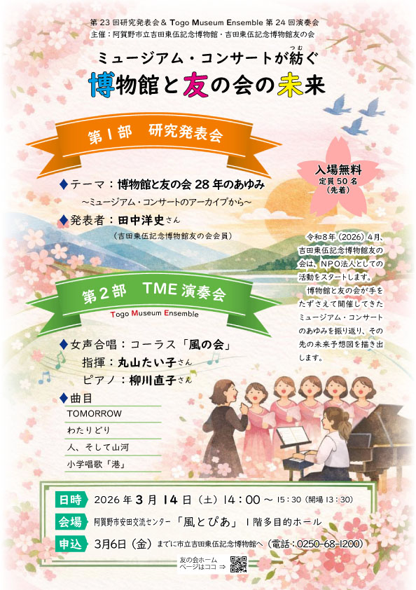 第23回研究発表会&TME第24回演奏会「ミュージアム・コンサートが紡ぐ博物館と友の会の未来」 2026年2月15日 最終更新日時 : 2026年2月15日 吉田東伍記念博物館友の会 友の会の会員田中洋史さんによる研究発表会と、コーラス「風の会」の皆さんによるTME演奏会です。ぜひご参加ください♪日時 2026年3月14日㈯14:00~15:30(会場13:30)会場 阿賀野市安田交流センター「風とぴあ」1階多目的ホール申込 3月6日㈮までに吉田東伍記念博物館へ(☎0280-68-1200)